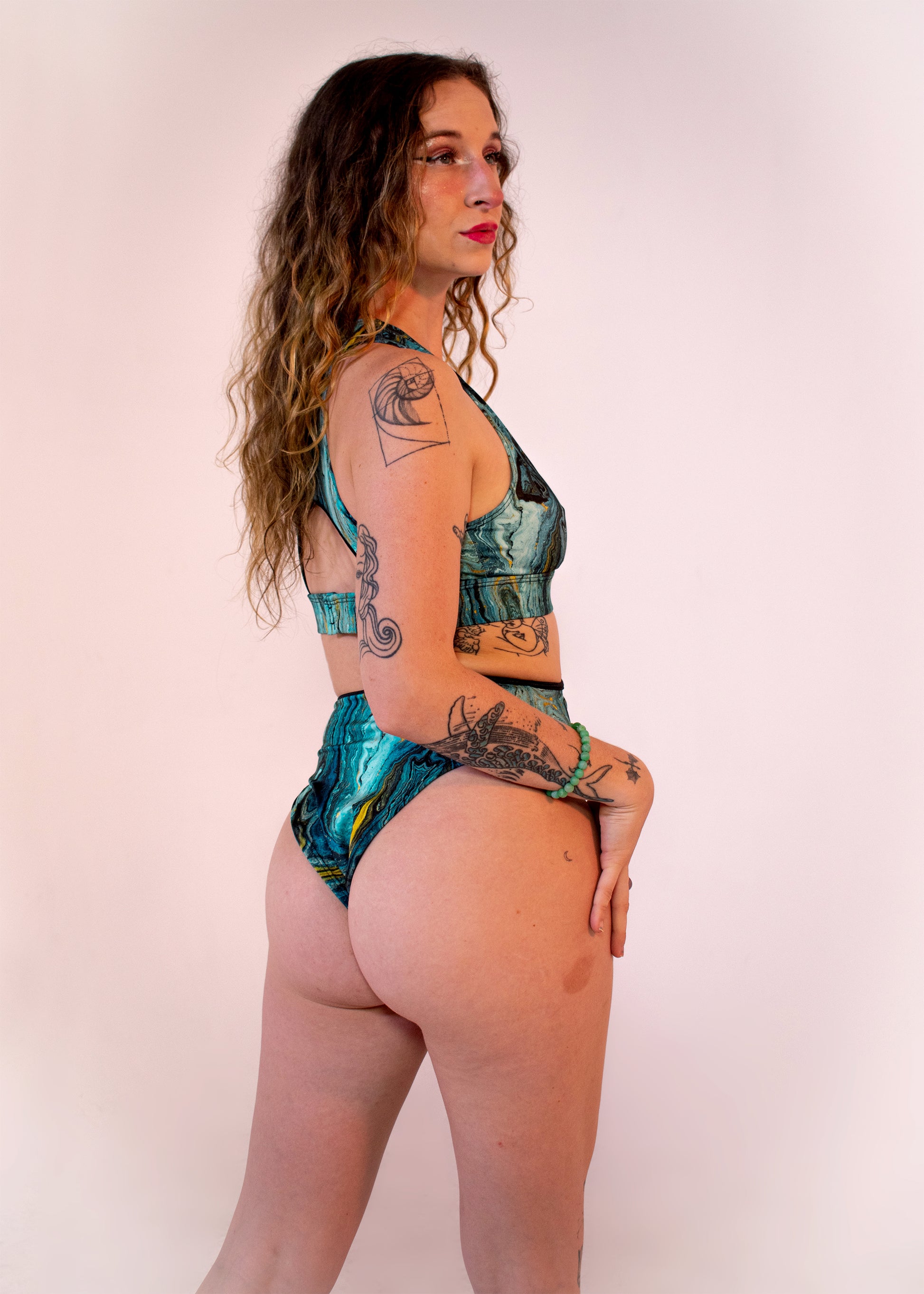 Crafted from our stunning Aquamarine Geode 4-way stretch spandex, this piece shines like a turquoise gemstone under festival lights. With its daring cutouts, high-cut bikini bottom, and supportive racerback fit, it delivers the perfect mix of performance and power.